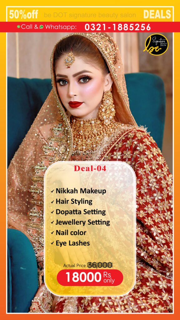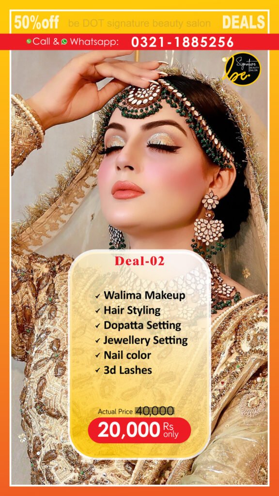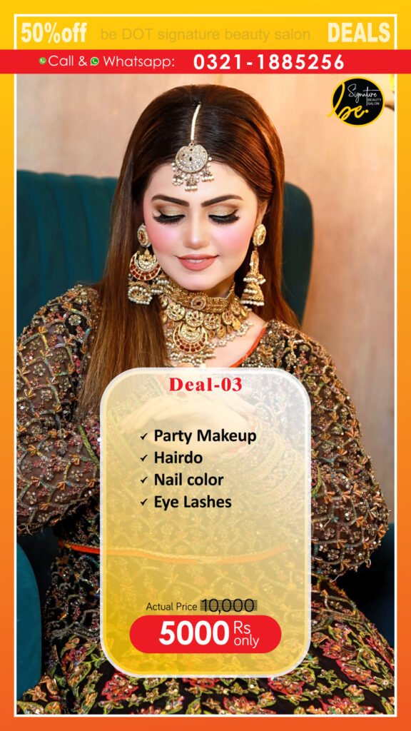 Makeup Deals Hair Deals Skin Deals Makup Deals Signature Bride (Barat) Signature Bride (Walima) Deal-01 (Bridal Makeup) Deal-02 (Walima Bride) Deal-03 (Party Makeup) Deal-04 (Nikkah Makeup) Deal-05 (Engagement) Deal-06(Mehndi Makeup) Hair Deals Brazilion Nuts(Treatment) Omega-0(Treatment) Nano-Plastica(Hair Treament) Hair Protein Deal-07 (Hair cut) Deal-08(Single color dye) Deal-09 (Highlights) Deal-10 (Keratin) Deal-11 (Xtenso) Deal-12 (Balayage) Deal-13 (Hair Botox) Skin Deals Deal-14 (whitening facial) Deal-15 (Hydra facial) Deal-16 (Gold facial) Deal-17 (Jannssen facial) Deal-18 (Hydra Facial 14 Steps) Deal-19 (Nail Services) Deal-20 (Silky Cool Facial) Waxing Custom Services